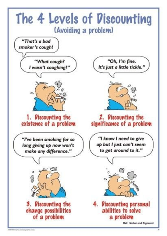 “The person who discounts believes or acts as though some aspect of the self, other people, or reality is less significant than it actually is. Impact is reduced, usually purposefully, to maintain a frame of reference, to play games, to further script, and to attempt to enforce or confirm symbiotic relationships with others.” (Mellor and Schiff, 1975, p. 295).